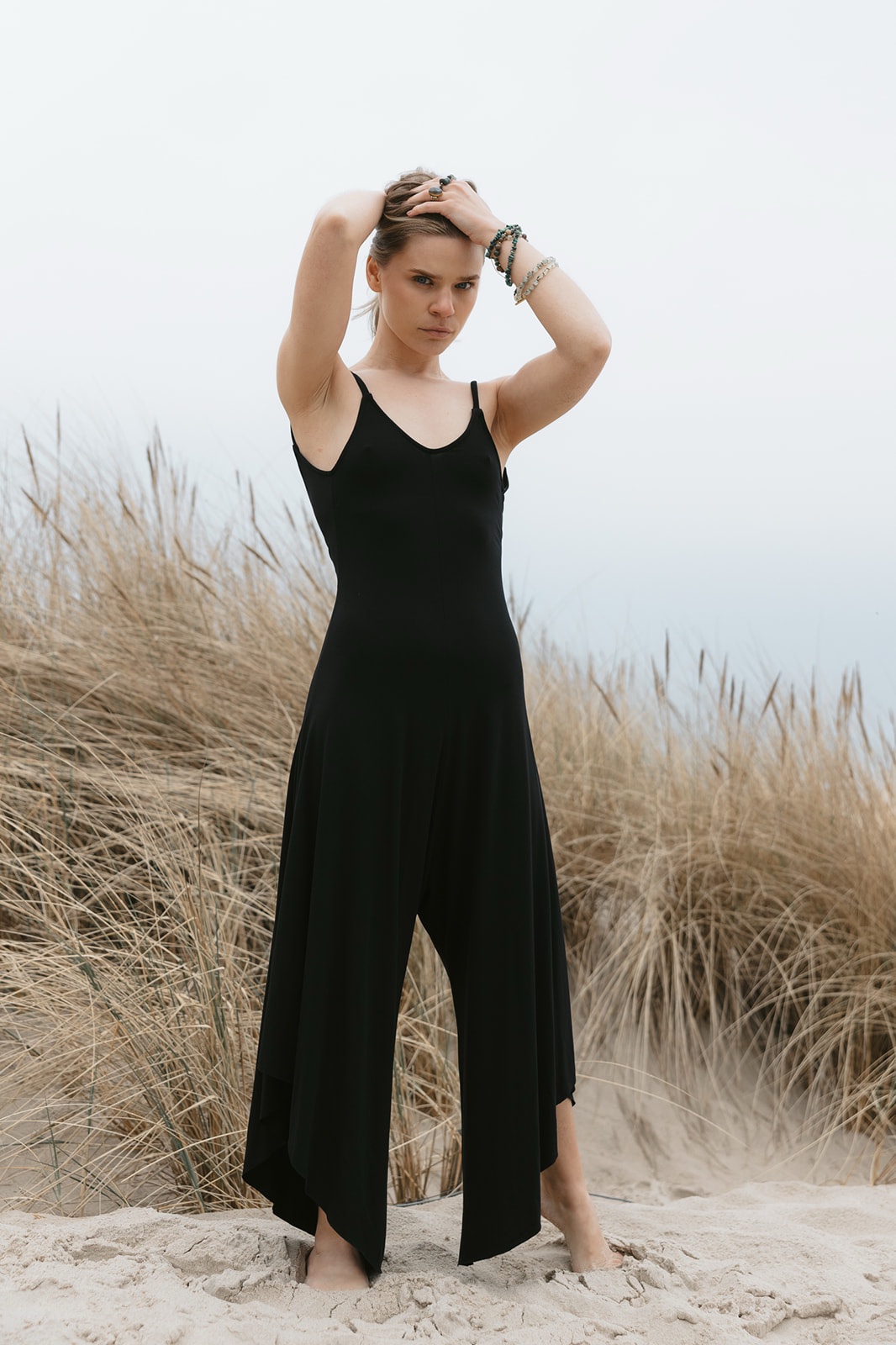 Ten kombinezon robi wrażenie. Miękko układa się na ciele, płynie przy każdym ruchu. Szerokie, asymetryczne nogawki dodają mu lekkości i dynamiki, a cienkie ramiączka z wycięciem na plecach subtelnie odsłaniają to co najpiękniejsze. Idealny balans między wygodą a kobiecością- na jogę, spacer i wieczorne wyjście.