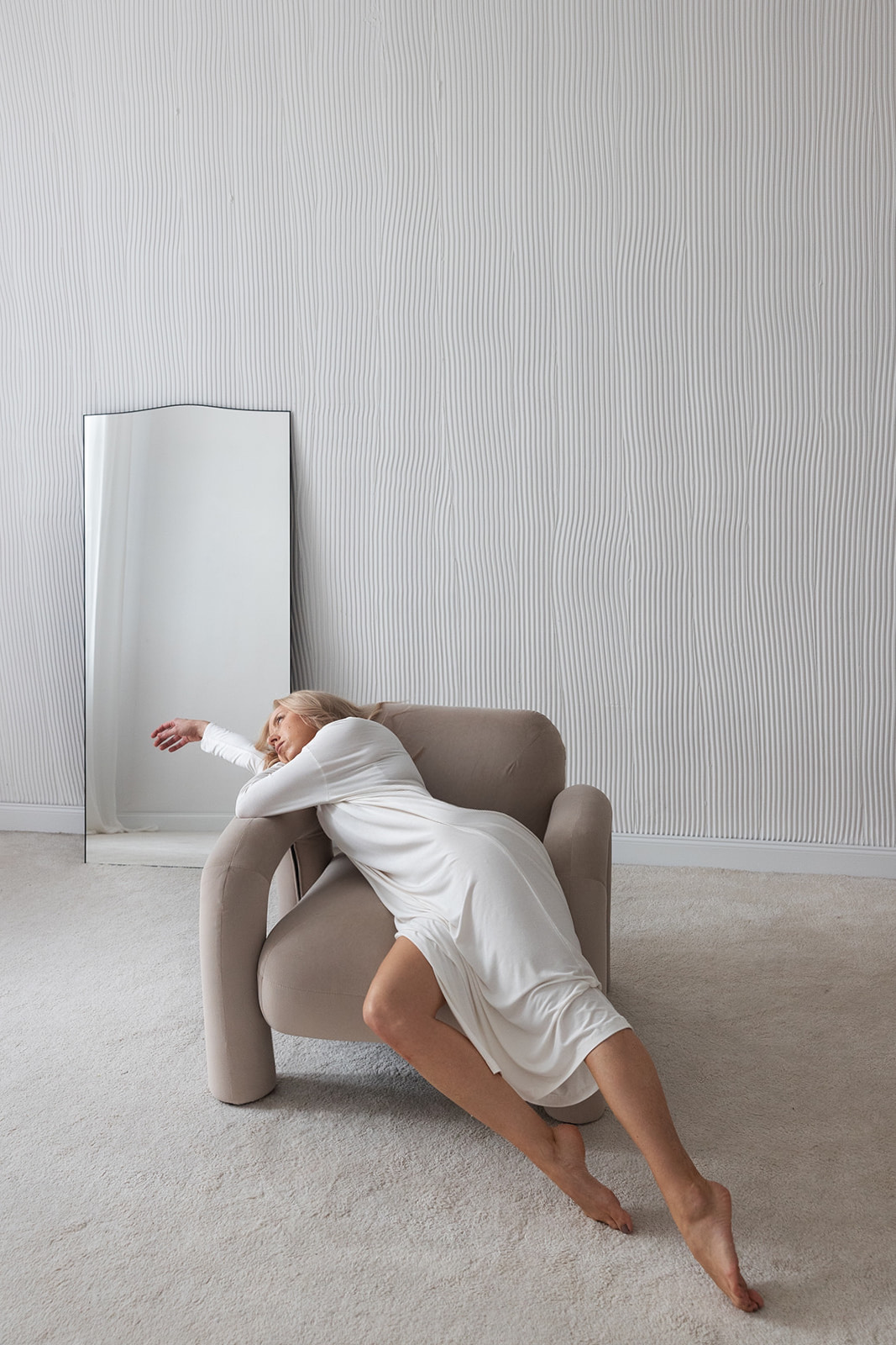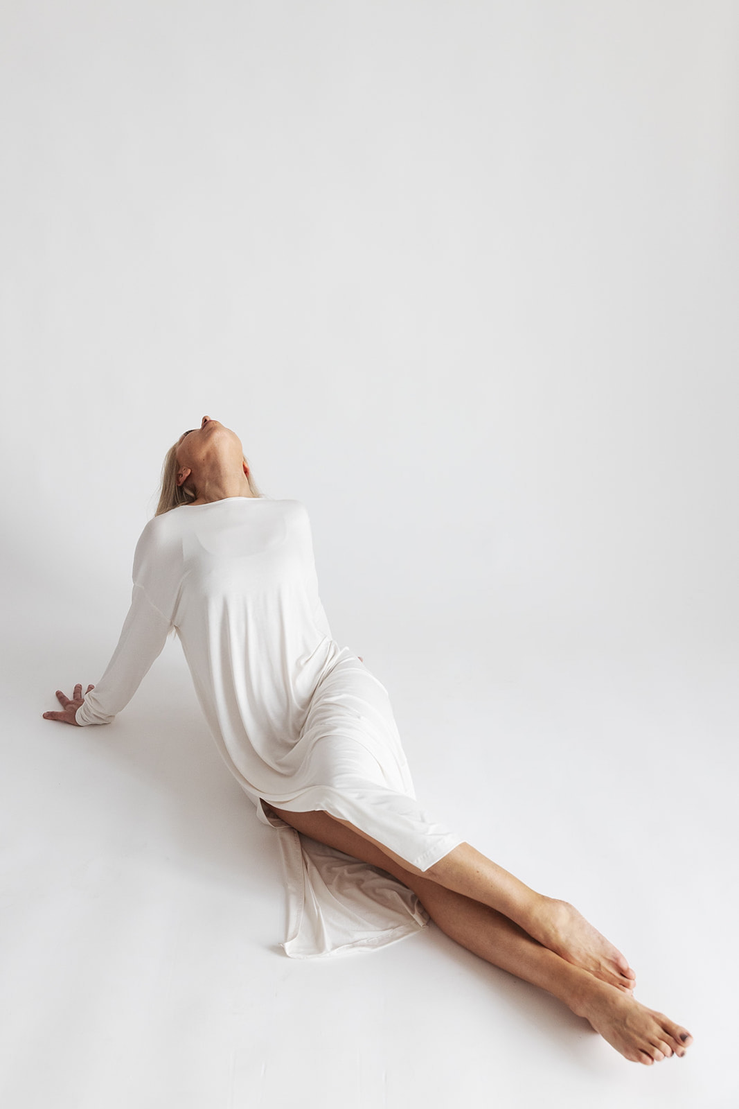 Długi oversizowy t-shirt w formie długiej sukienki. Przydługie rękawy i rozcięcie na prawym udzie.