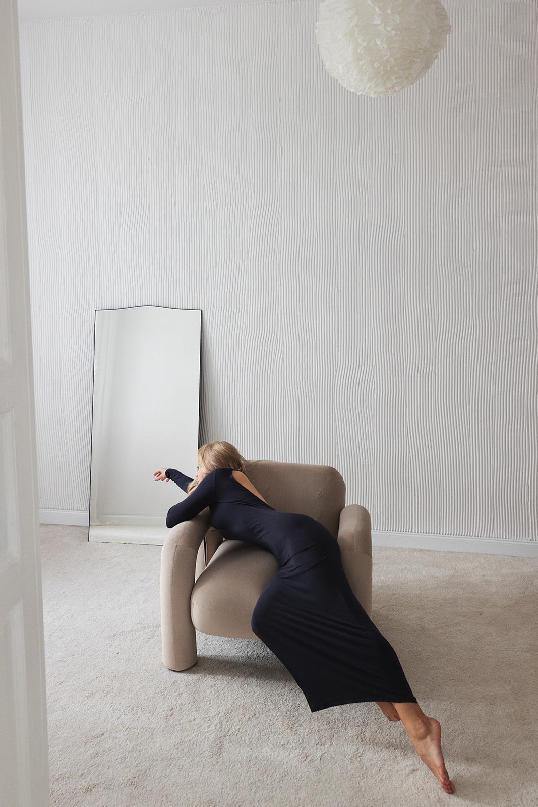Długa, dopasowana sukienka z uwodzicielskim rozcięciem na prawym udzie. Dekolt, który odsłania całe