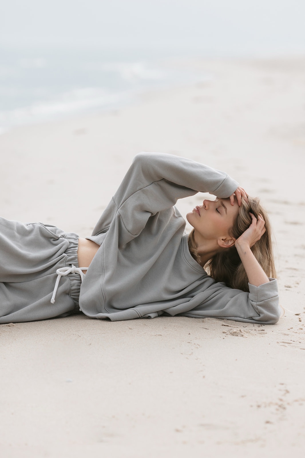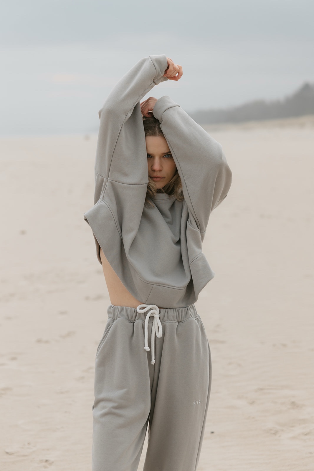 Spodnie dresowe typu oversize z wysokim stanem. Zakończone gumką nad kostką, w pasie dodatkowo